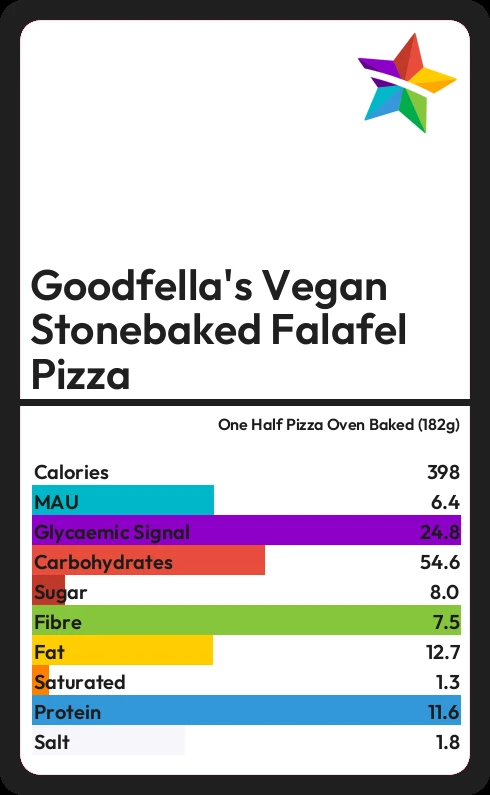 Goodfella's Vegan Stonebaked Falafel Pizza contains 398.6 calories in one Half Pizza Oven Baked (182g).