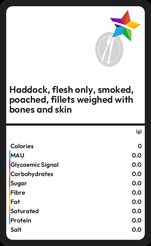 Haddock, flesh only, smoked, poached, fillets weighed with bones and skin contains no sugar in 100g