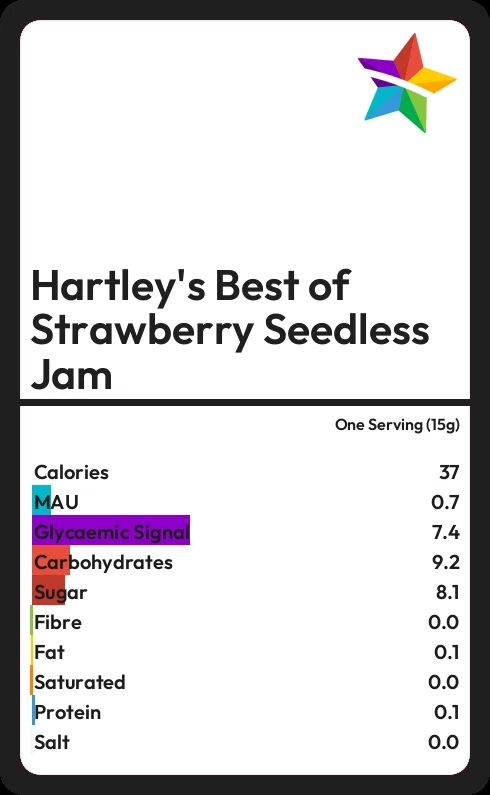 Hartley's Best of Strawberry Seedless Jam contains 8.1g sugar in one Serving (15g) - that is around 2 cubes of sugar.