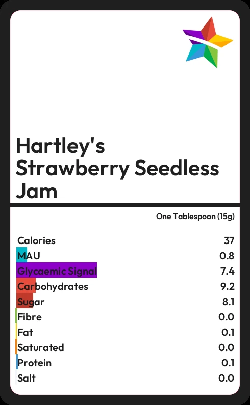 Hartley's Strawberry Seedless Jam contains 37.4 calories in one Tablespoon (15g).
