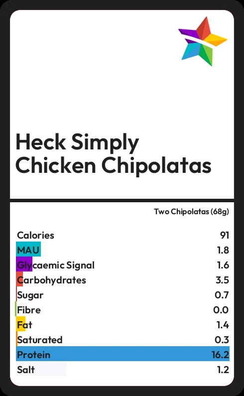 Heck Simply Chicken Chipolatas contains 0.7g sugar in two Chipolatas (68g)