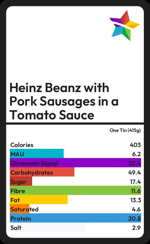 Heinz Beanz with Pork Sausages in a Tomato Sauce contains 402.6 calories in one Tin (415g).