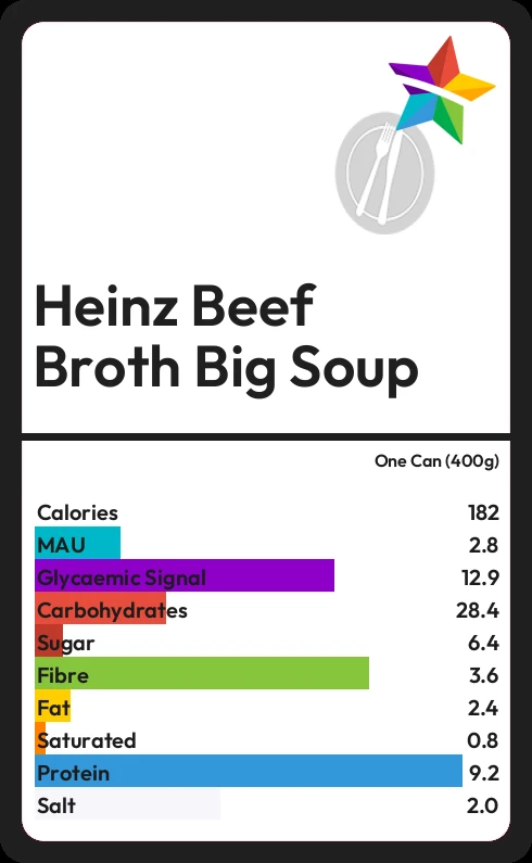 Heinz Beef Broth Big Soup contains 180 calories in one Can (400g).