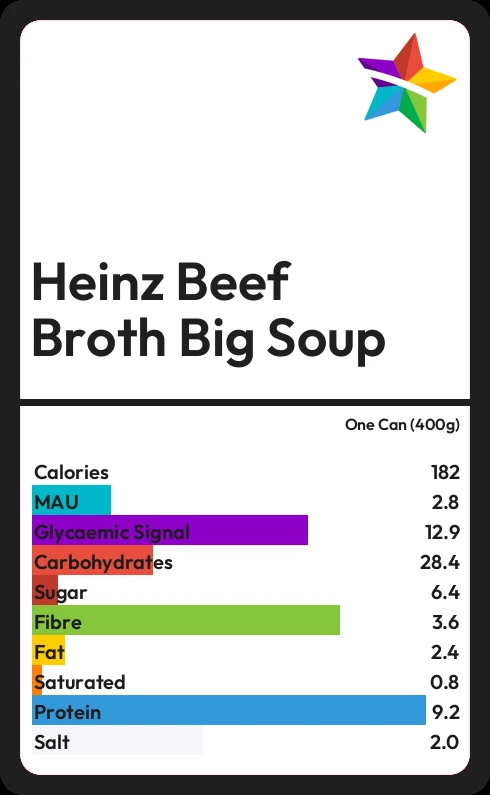 Heinz Beef Broth Big Soup contains 180 calories in one Can (400g).