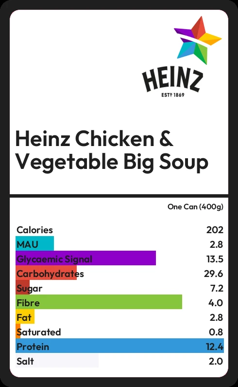 Heinz Chicken & Vegetable Big Soup contains 200 calories in one Can (400g).