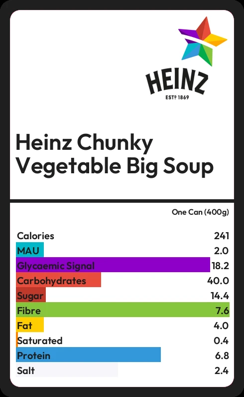 Heinz Chunky Vegetable Big Soup contains 240 calories in one Can (400g).