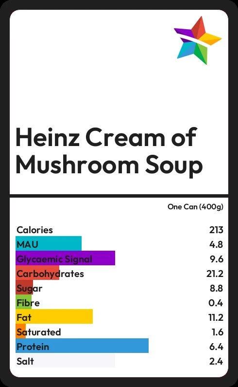 Heinz Cream of Mushroom Soup contains 212 calories in one Can (400g).