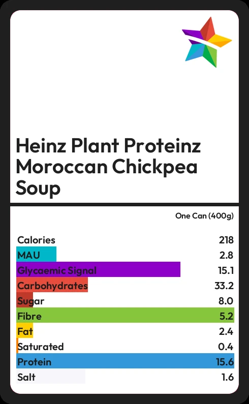 Heinz Plant Proteinz Moroccan Chickpea Soup contains 220 calories in one Can (400g).