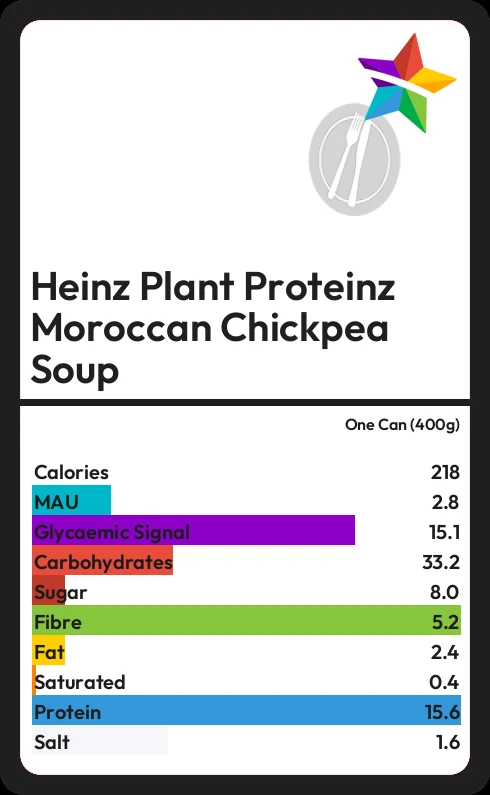 Heinz Plant Proteinz Moroccan Chickpea Soup contains 220 calories in one Can (400g).
