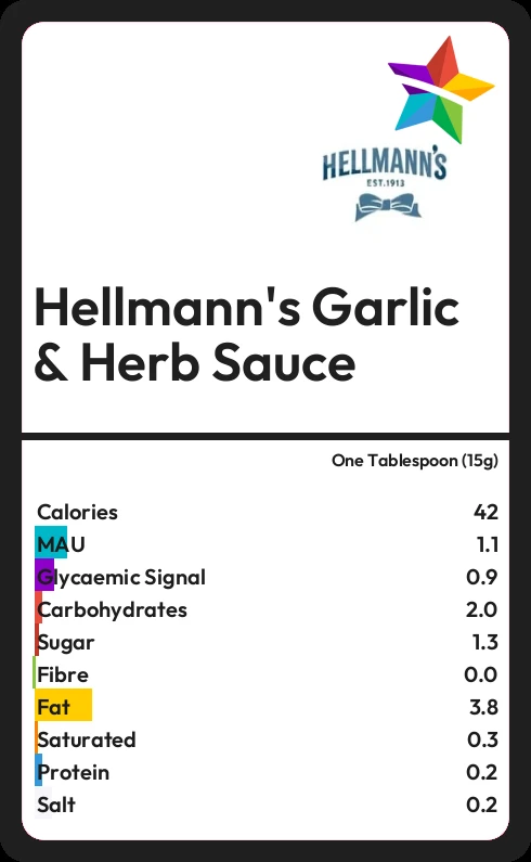 Hellmann's Garlic & Herb Sauce contains 1.3g sugar in one Tablespoon (15g)