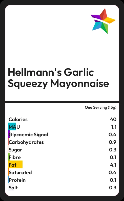 Hellmann's Garlic Squeezy Mayonnaise contains 0.3g sugar in one Serving (15g)