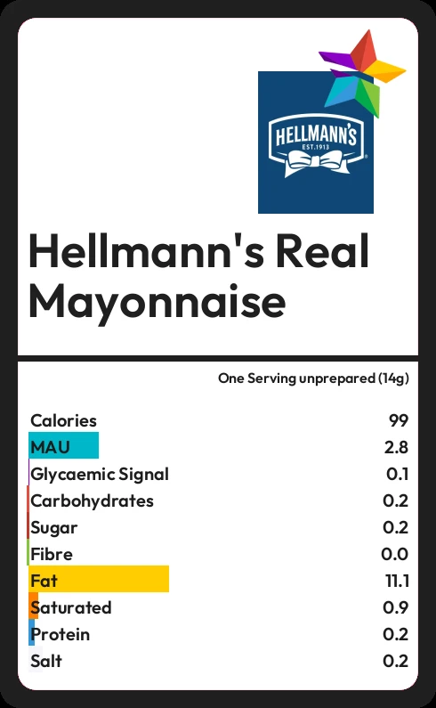 Hellmann's Real Mayonnaise contains 0.2g sugar in one Serving unprepared (14g)