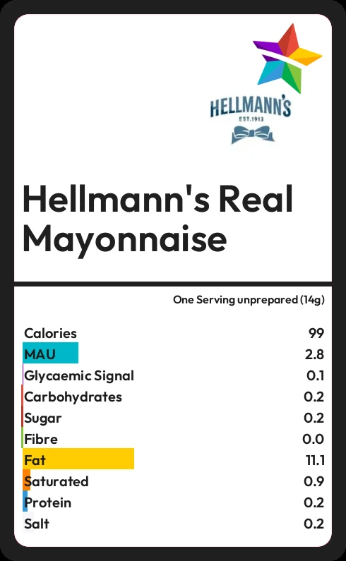 Hellmann's Real Mayonnaise contains 0.2g sugar in one Serving unprepared (14g)