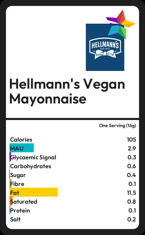Hellmann's Vegan Mayonnaise contains 104.6 calories in one Serving (16g).