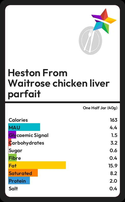 Heston From Waitrose chicken liver parfait contains 0.6g sugar in one Half Jar (40g)