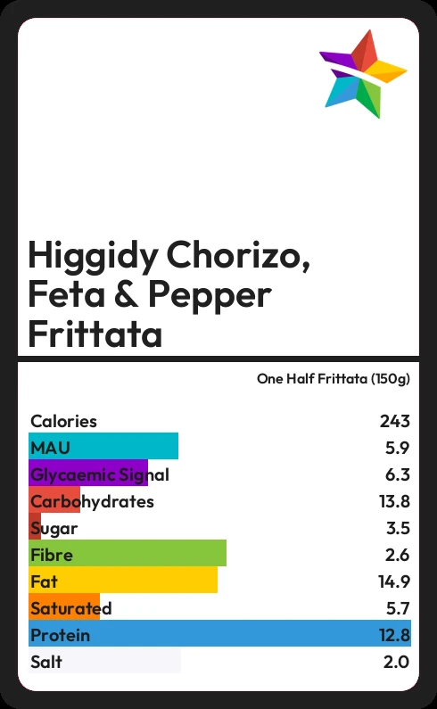 Higgidy Chorizo, Feta & Pepper Frittata contains 3.5g sugar in one Half Frittata (150g) - that is around 1 cube of sugar.
