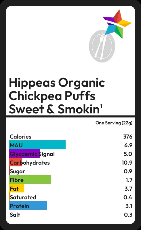 Hippeas Organic Chickpea Puffs Sweet & Smokin' contains 0.9g sugar in one Serving (22g)