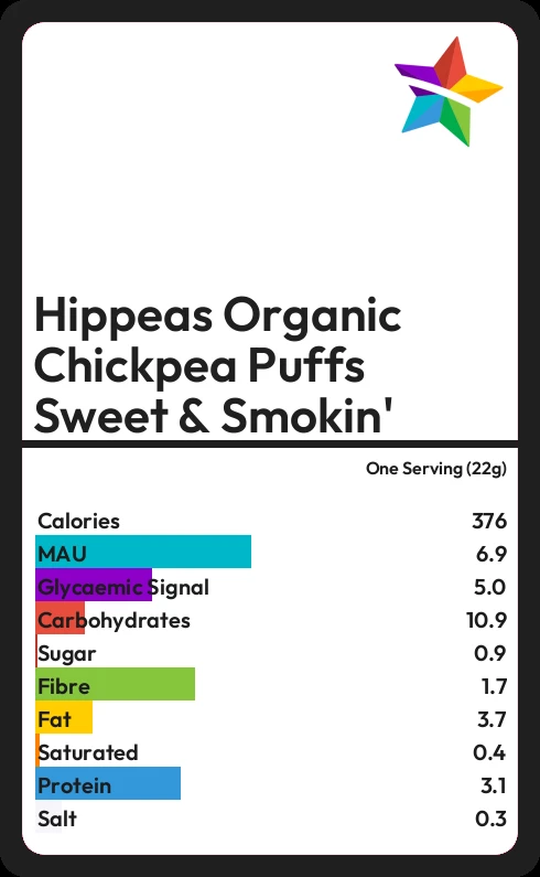 Hippeas Organic Chickpea Puffs Sweet & Smokin' contains 0.9g sugar in one Serving (22g)