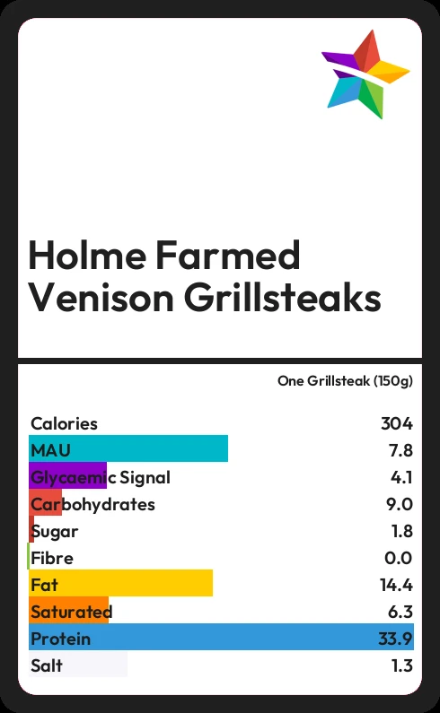Holme Farmed Venison Grillsteaks contains 1.8g sugar in one Grillsteak (150g)