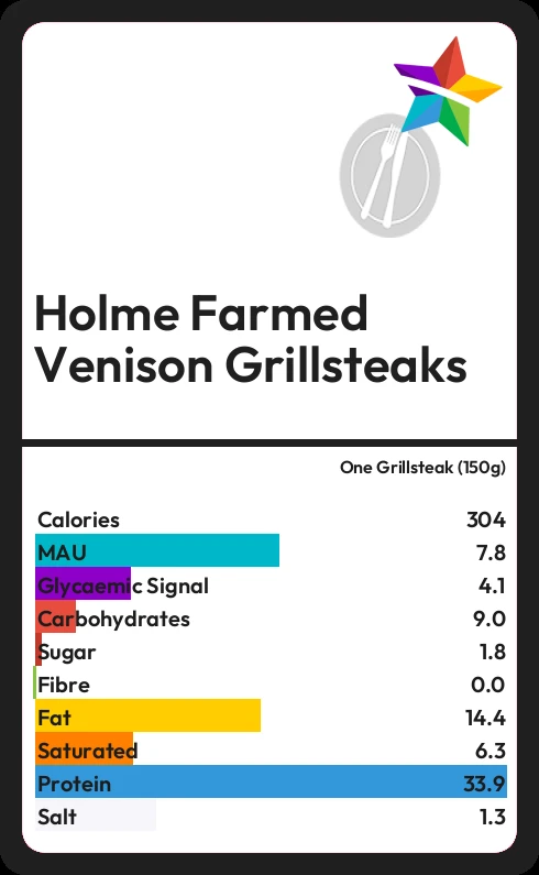 Holme Farmed Venison Grillsteaks contains 1.8g sugar in one Grillsteak (150g)