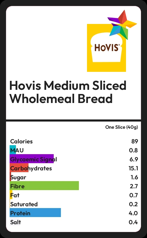 Hovis Medium Sliced Wholemeal Bread contains 1.6g sugar in one Slice (40g)