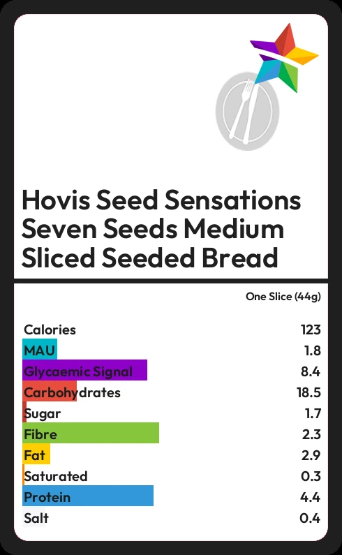 Hovis Seed Sensations Seven Seeds Medium Sliced Seeded Bread contains 123.2 calories in one Slice (44g).
