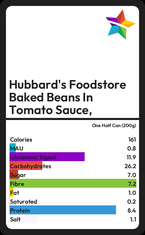 Hubbard's Foodstore Baked Beans In Tomato Sauce, contains 162 calories in one Half Can (200g).