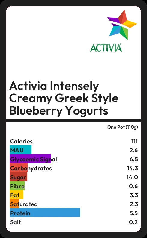 Activia Intensely Creamy Greek Style Blueberry Yogurts contains 111.1 calories in one Pot (110g).