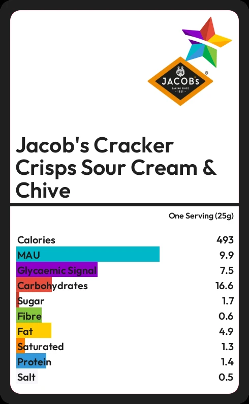 Jacob's Cracker Crisps Sour Cream & Chive contains 1.7g sugar in one Serving (25g)