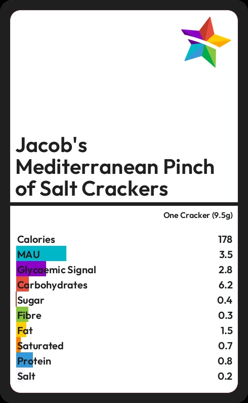 Jacob's Mediterranean Pinch of Salt Crackers contains 177.8 calories in one Cracker (9.5g).