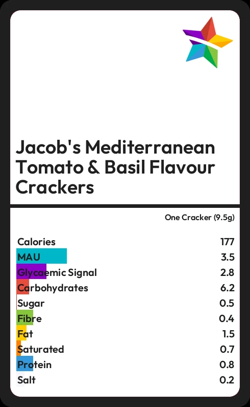 Jacob's Mediterranean Tomato & Basil Flavour Crackers contains 176.5 calories in one Cracker (9.5g).