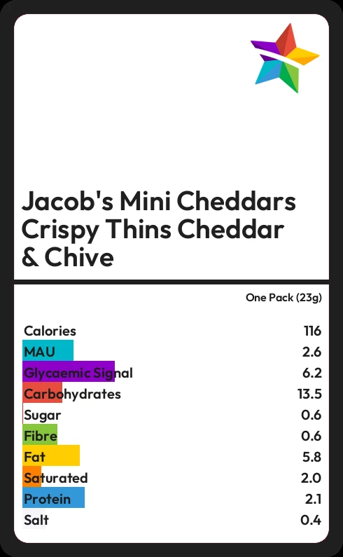 Jacob's Mini Cheddars Crispy Thins Cheddar & Chive contains 116.2 calories in one Pack (23g).