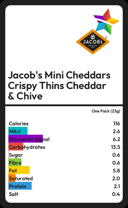 Jacob's Mini Cheddars Crispy Thins Cheddar & Chive contains 116.2 calories in one Pack (23g).