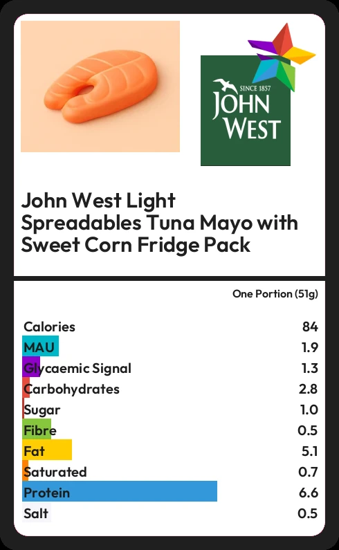John West Light Spreadables Tuna Mayo with Sweet Corn Fridge Pack contains 84.2 calories in one Portion (51g).