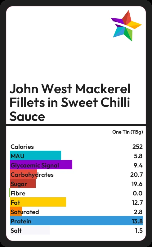 John West Mackerel Fillets in Sweet Chilli Sauce contains 251.9 calories in one Tin (115g).