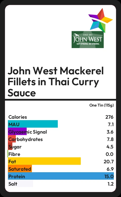 John West Mackerel Fillets in Thai Curry Sauce contains 276 calories in one Tin (115g).