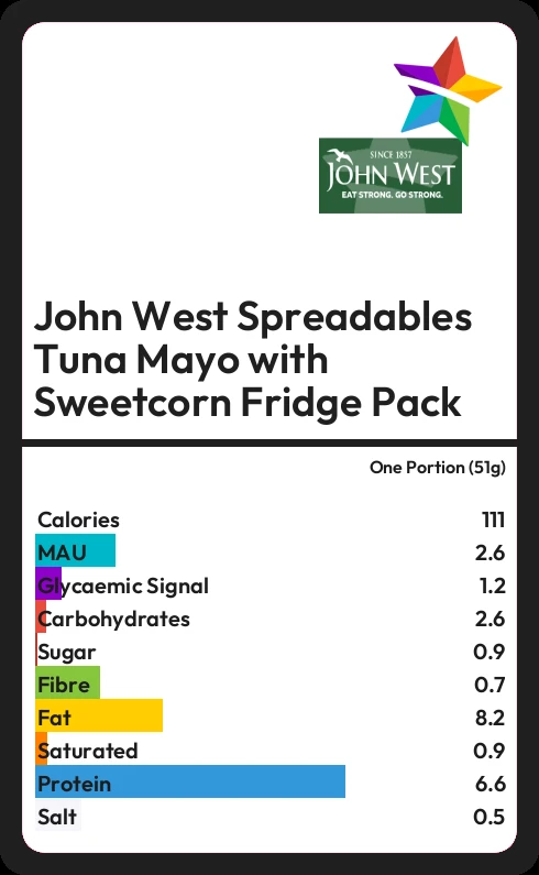 John West Spreadables Tuna Mayo with Sweetcorn Fridge Pack contains 0.9g sugar in one Portion (51g)