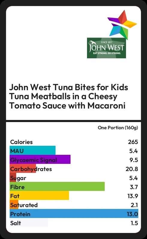 John West Tuna Bites for Kids Tuna Meatballs in a Cheesy Tomato Sauce with Macaroni contains 265.6 calories in one Portion (160g).