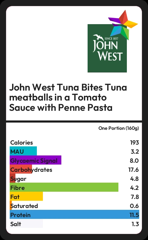 John West Tuna Bites Tuna meatballs in a Tomato Sauce with Penne Pasta contains 193.6 calories in one Portion (160g).