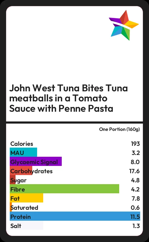 John West Tuna Bites Tuna meatballs in a Tomato Sauce with Penne Pasta contains 193.6 calories in one Portion (160g).