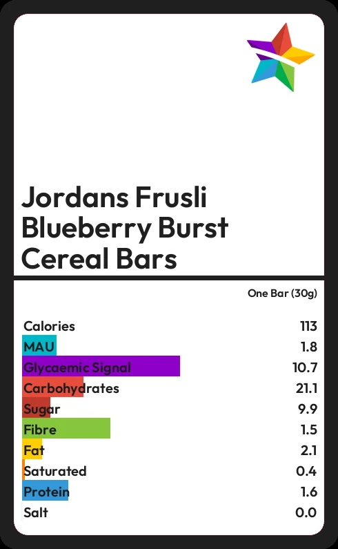 Jordans Frusli Blueberry Burst Cereal Bars contains 113.4 calories in one Bar (30g).