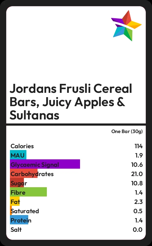 Jordans Frusli Cereal Bars, Juicy Apples & Sultanas contains 114.3 calories in one Bar (30g).