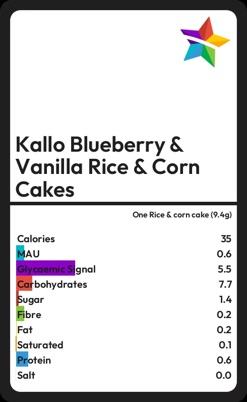 Kallo Blueberry & Vanilla Rice & Corn Cakes contains 35.4 calories in one Rice & corn cake (9.4g).