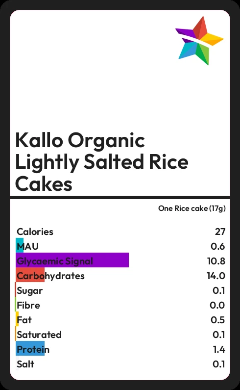 Kallo Organic Lightly Salted Rice Cakes contains 0.1g sugar in one Rice cake (17g)