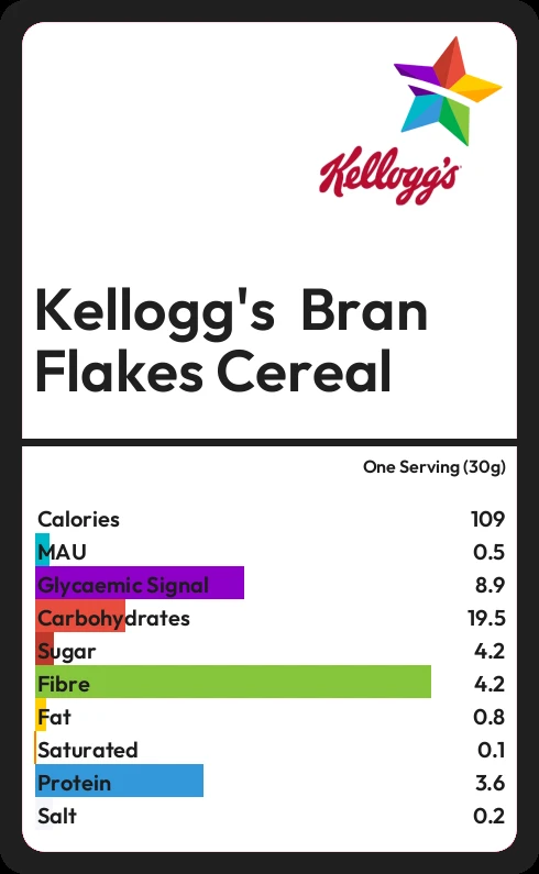 Kellogg's Bran Flakes Cereal contains 108.6 calories in one Serving (30g).