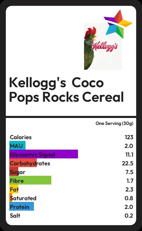 Kellogg's Coco Pops Rocks Cereal contains 123 calories in one Serving (30g).
