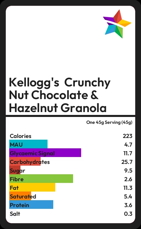 Kellogg's Crunchy Nut Chocolate & Hazelnut Granola contains 9.5g sugar in one 45g Serving (45g) - that is around 2 cubes of sugar.