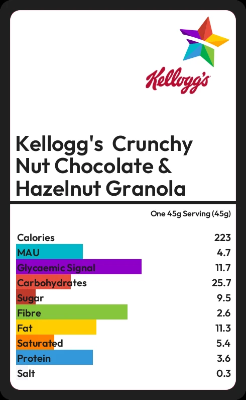 Kellogg's Crunchy Nut Chocolate & Hazelnut Granola contains 223.2 calories in one 45g Serving (45g).