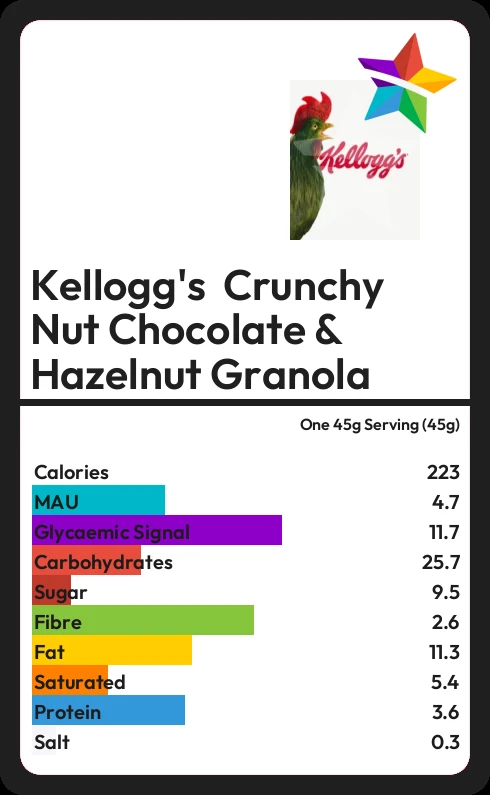 Kellogg's Crunchy Nut Chocolate & Hazelnut Granola contains 223.2 calories in one 45g Serving (45g).