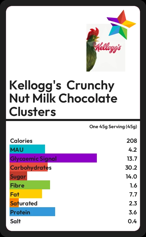 Kellogg's Crunchy Nut Milk Chocolate Clusters contains 14.0g sugar in one 45g Serving (45g) - that is around 4 cubes of sugar.
